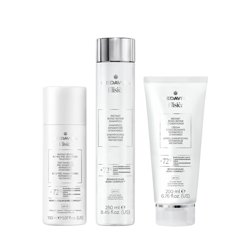 Medavita Instant Bond Repair Kit è il trattamento professionale formulato per riparare e rinforzare istantaneamente i legami della fibra capillare già durante il lavaggio.