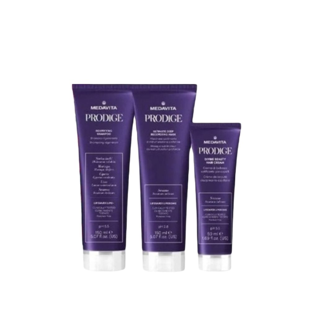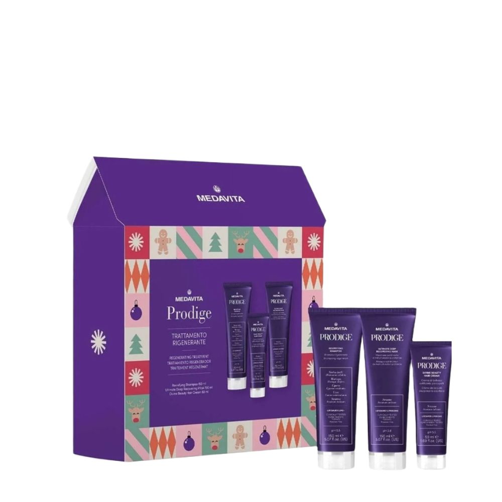 l Cofanetto Natale Medavita Prodige è il rituale ideale per chi desidera capelli profondamente ristrutturati, luminosi e setosi. Formulato con tecnologie avanzate e attivi altamente performanti, pensati per rigenerare la fibra capillare, nutrire in profondità e donare un finish impeccabile. Il kit contiene: